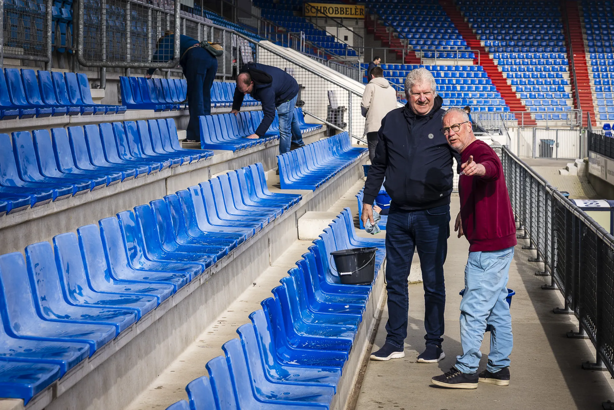 De deelnemers gingen in verschillende vakken aan de slag om stoeltjes, tribunes en omlopen schoon te maken. Ook schoonmaakpartner GOM leverde een bijdrage en hielp mee bij het reinigen van meerdere tribunevakken, waardoor het stadion er weer verzorgd bij ligt.